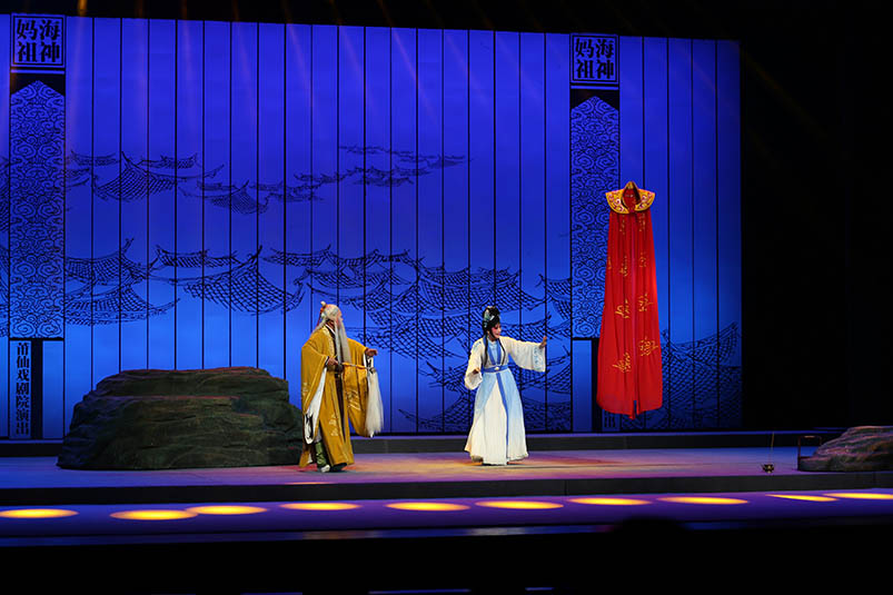莆仙戲《海神媽祖》主要描述的是林默娘痛心海難無情而無私救苦救難,深得上天感動,最終被授予遇災(zāi)警示及造福于民的法力,從平凡漁家女子到海上女神的傳奇。劇目以敘事詩般的藝術(shù)手法刻畫出媽祖娘娘扶危濟(jì)困的偉大形象,靈活展示了媽祖娘娘德、行善、大愛”的精神。隨著海上貿(mào)易和文化交流的延伸,媽祖信俗從沿海各地傳播到東南亞乃至全世界,媽祖也因此成為了“海上絲綢之路保護(hù)神”。