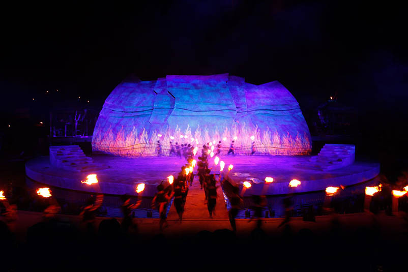 《阿惹妞》作為一部風(fēng)情實(shí)景劇,演出舞臺(tái)全部為戶外實(shí)景,既有遠(yuǎn)山又有流水,場景宏大,因此對舞臺(tái)景物布光要求很高,不僅要使景物光線分布均勻且達(dá)到足夠的亮度,對燈光的層次性要求也非常高,既要保證遠(yuǎn)方山峰的輪廓清晰可見,又要讓觀眾看得清舞臺(tái)中區(qū)演員的表演。G12 HYBRID 能夠做到大范圍均勻鋪光,且具有超高光通量,發(fā)光效率高的同時(shí)具備遠(yuǎn)距離照射的能力,在保證遠(yuǎn)景和中景清晰的前提下,運(yùn)用G12 HYBRID亮度變化,配合現(xiàn)場光焰等特效,能夠制造出極具擴(kuò)張感的震撼視覺效果。