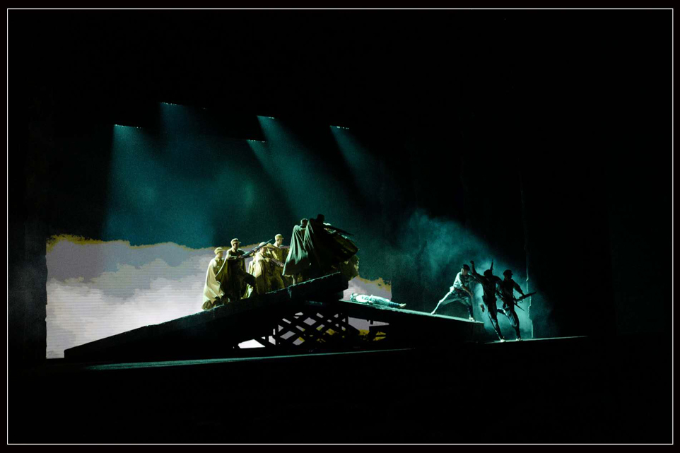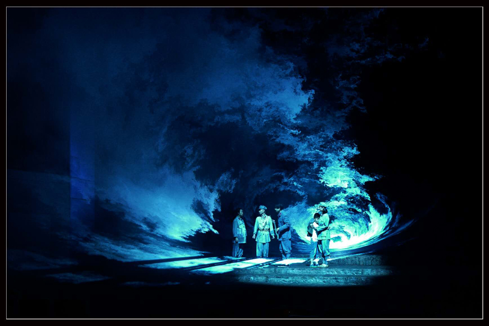 舞臺劇中 “交互式”的藝術(shù)表現(xiàn)形式,涵蓋了話劇、舞劇、舞臺美術(shù)、音樂、音響、多媒體、燈光等一系列在其中,讓劇目更具有生命力,更具有視覺感官沖擊,能夠?qū)v史重現(xiàn)在觀眾的眼前,呈現(xiàn)一個逼真的全維度感官場景。