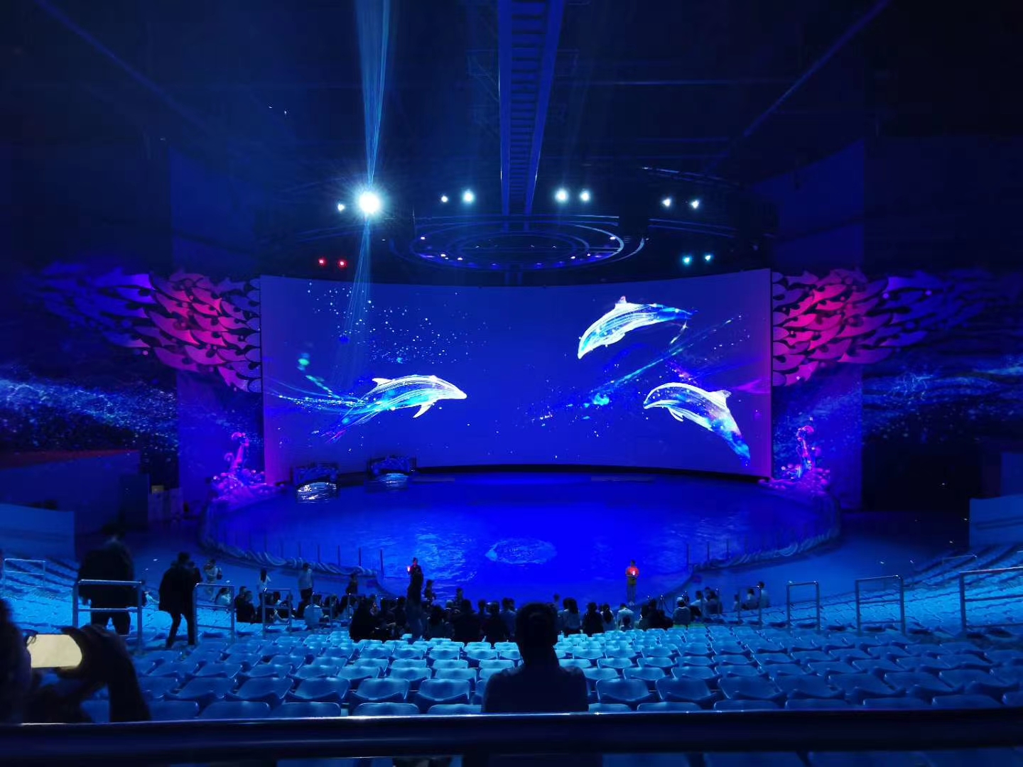 夢幻海豚劇場,超大海洋觀景空間,通過燈光與聲音營造場景氛圍,引導及推動表演的進行。一幕幕獨特新穎的表演形式、炫彩華麗的燈光舞美,讓人仿佛置身深邃的海洋之境,感慨人與自然的和諧共處。