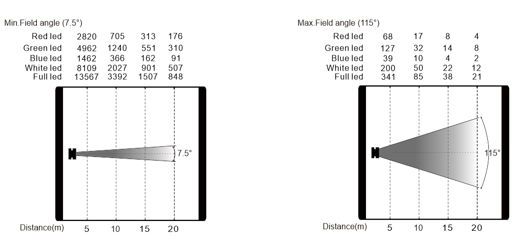 變焦范圍:5.5°-59°(光束角),7.5°-115°(光斑角)