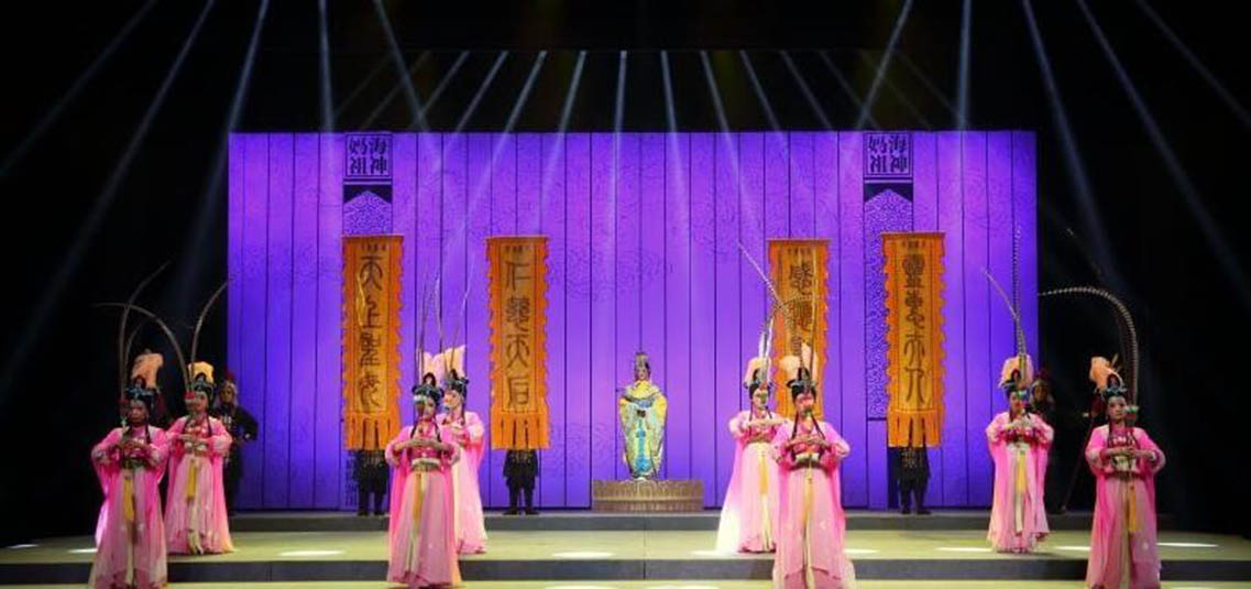 莆仙戲《海神媽祖》主要描述的是林默娘痛心海難無情而無私救苦救難,深得上天感動,最終被授予遇災(zāi)警示及造福于民的法力,從平凡漁家女子到海上女神的傳奇。劇目以敘事詩般的藝術(shù)手法刻畫出媽祖娘娘扶危濟(jì)困的偉大形象,靈活展示了媽祖娘娘德、行善、大愛”的精神。隨著海上貿(mào)易和文化交流的延伸,媽祖信俗從沿海各地傳播到東南亞乃至全世界,媽祖也因此成為了“海上絲綢之路保護(hù)神”。