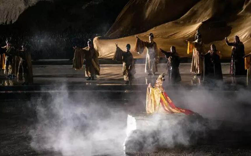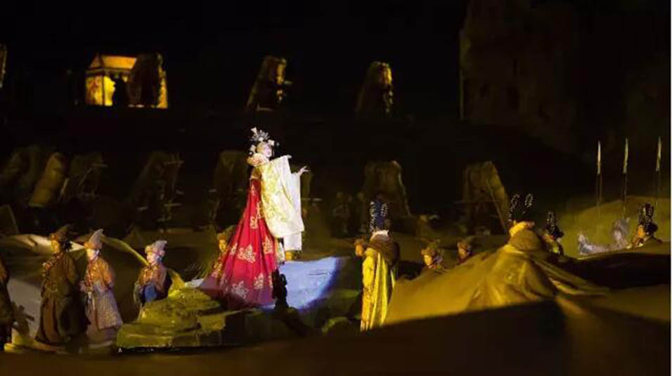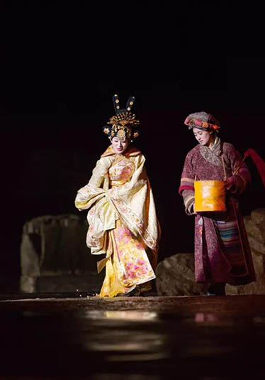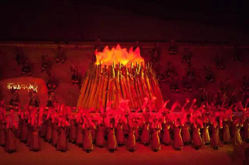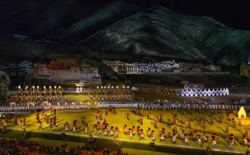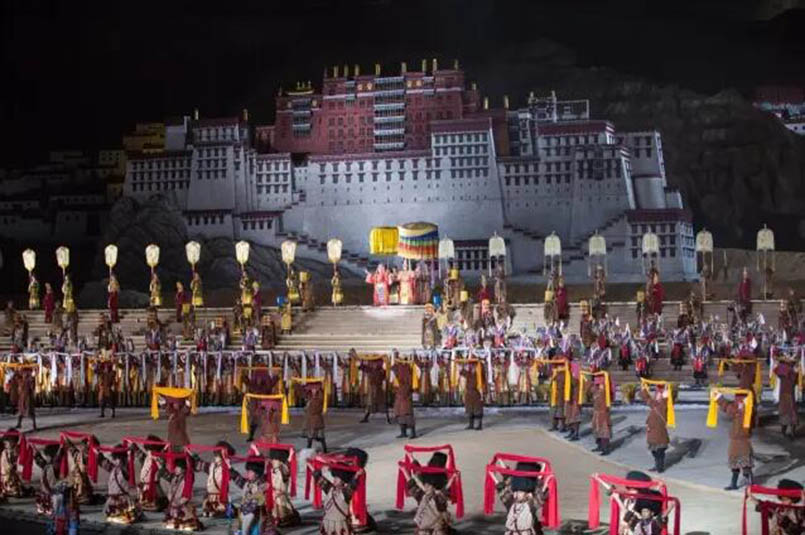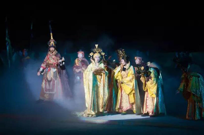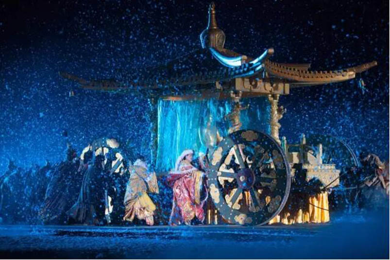 大型藏族實(shí)景劇《文成公主》主要講述文成公主入藏歷經(jīng)艱難的征途和曲折起伏的心路歷程,演繹大唐盛世的愛情傳奇,傳唱漢藏和美的動人史歌。該作品分為“大唐之韻”、“天地梵音”、“藏舞大美”、“藏舞大美”及“藏舞大美”五幕,深度融入漢藏歷史文化、民族風(fēng)俗、自然景觀等,引入了大唐歌舞和流傳久遠(yuǎn)的藏舞、藏戲、佛號念唱等,通過人工舞臺與自然山水的結(jié)合,用高科技的手段呈現(xiàn)非物質(zhì)文化遺產(chǎn),把戲劇、音樂、舞蹈和現(xiàn)代舞美手段融為一爐,構(gòu)成華美樂章。