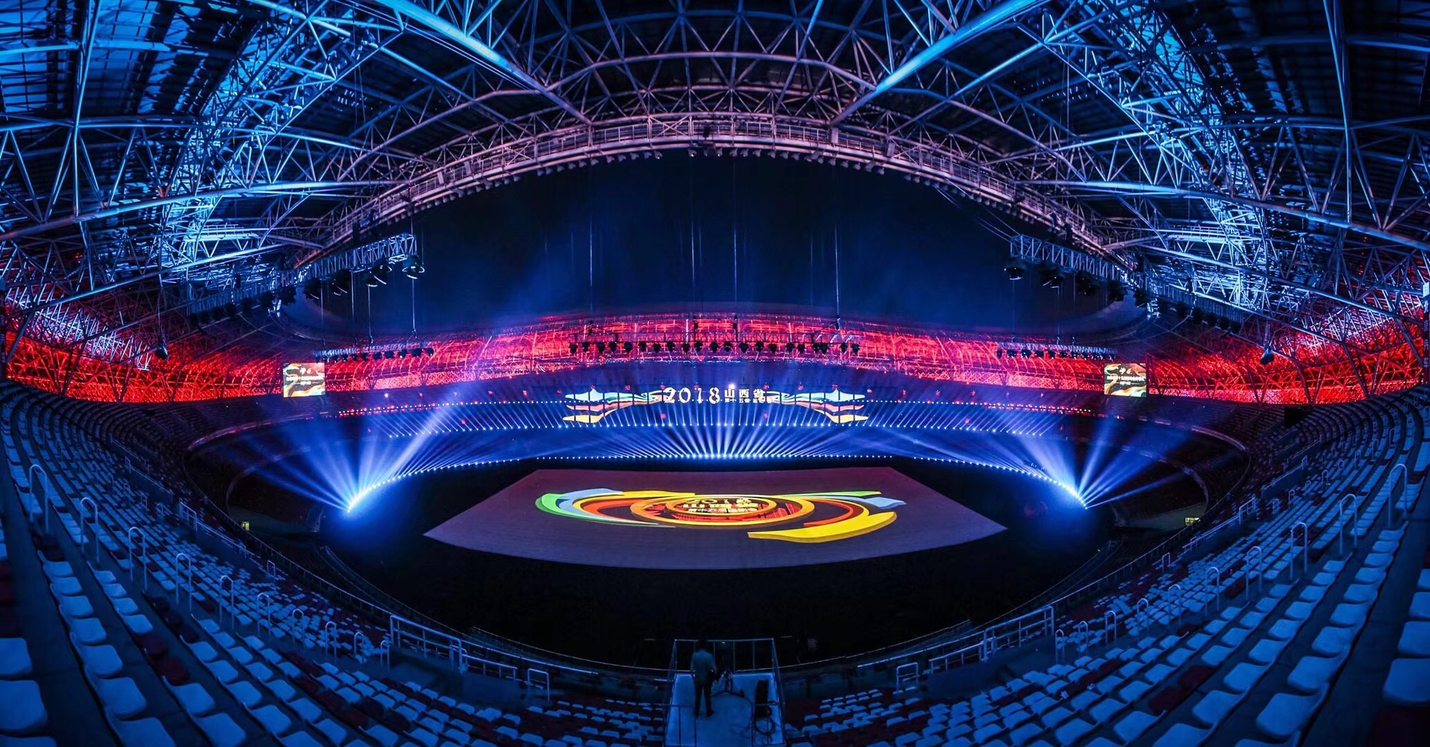 運(yùn)動會開閉幕式整體設(shè)計(jì)的核心理念為“奮斗幸福觀”,開幕式的主題為“奮斗新時代“,閉幕式將以“幸福新征程”為主題與之呼應(yīng)。開幕式演出運(yùn)用了大型燈光設(shè)備、舞臺機(jī)械裝置、高清投影設(shè)備、懸掛表演裝置、先進(jìn)音響設(shè)備、空中飛行設(shè)備等多種技術(shù)手段,形成地面、舞臺、空中三維藝術(shù)呈現(xiàn)形式,將中國傳統(tǒng)文化與國際先進(jìn)科技進(jìn)行完美結(jié)合,形成一臺國際化高水準(zhǔn)的全景化演出。