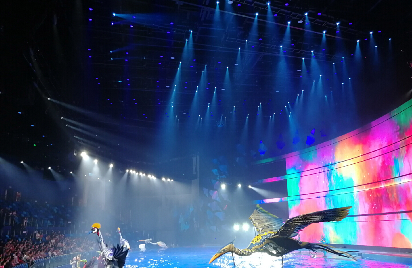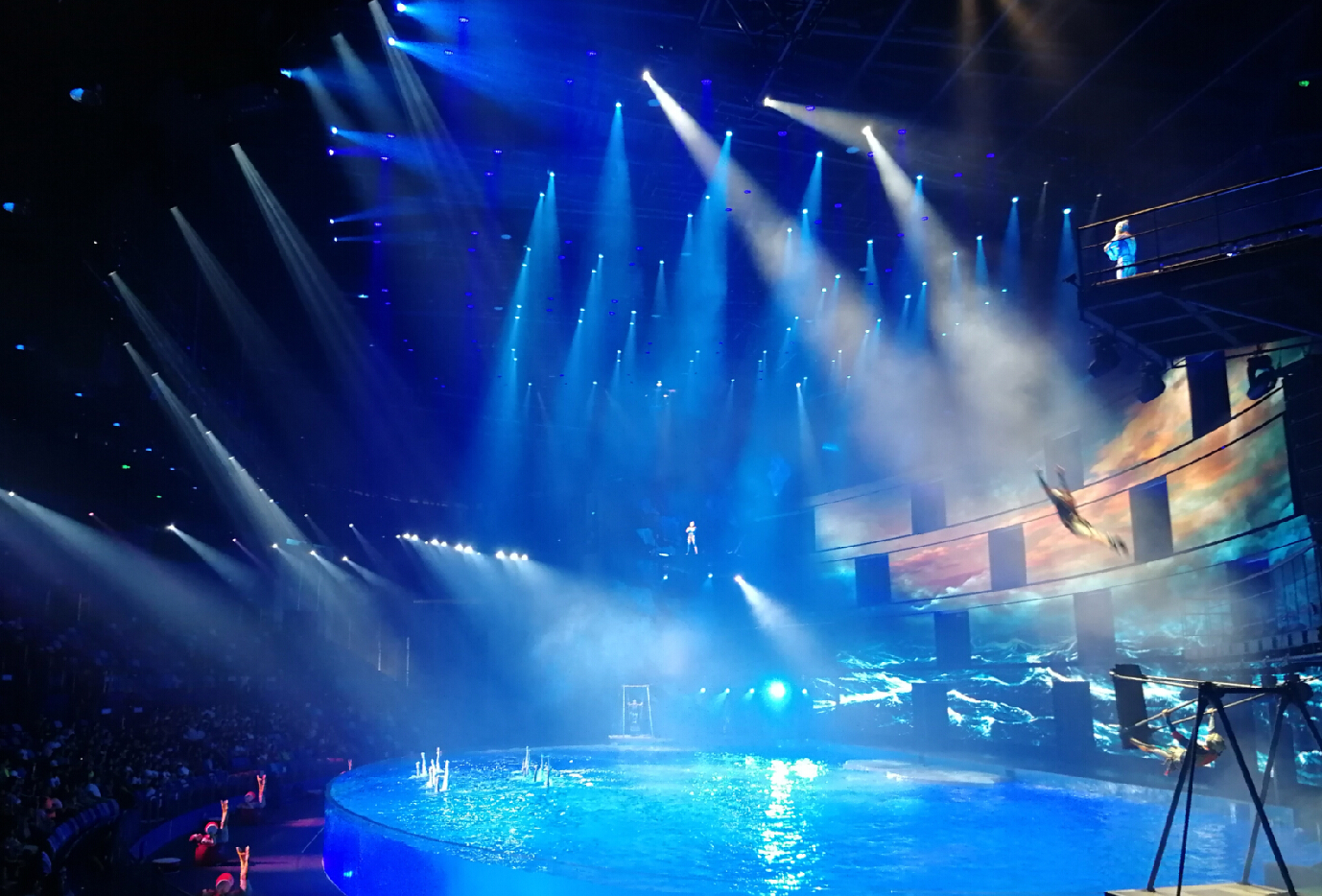 與以往單一劇場(chǎng)表演相比,《C秀》采用海陸空3D立體水舞臺(tái)劇場(chǎng),其中央水舞臺(tái)的容量高達(dá)7000立方米,相等于4個(gè)奧林匹克標(biāo)準(zhǔn)泳池的容量,水下密布的世界領(lǐng)先的舞臺(tái)技術(shù),能瞬間形成奇幻的水面神奇效果。海陸空三位一體的舞臺(tái)設(shè)計(jì),搭配三面環(huán)繞式立體的觀眾席,將舞臺(tái)與觀眾席融為一體,為觀眾置身于“沉浸式”的觀看體驗(yàn)。